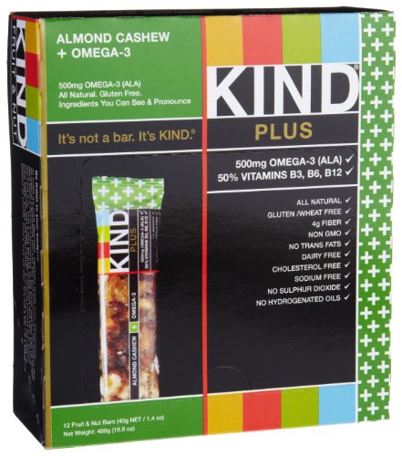 KIND is a brand of all-natural whole nut and fruit bars made from ingredients you can see and pronounce, and it's also a movement that gives new purpose to snacking. Almond Cashew + Flax (Omega-3) is a powerful, tasty combination. Each delicious bar have 180 calories, 4 grams of fiber, 500 ml of ALA, and 50 percent of the daily value of vitamins B3, B6, and B12.